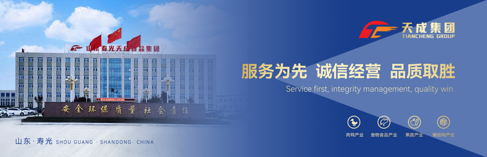 山東壽光天成食品集團(tuán)有限公司創(chuàng)建于1980年,是一家以櫻桃谷肉鴨和寵物食品加工產(chǎn)業(yè)為主,集飼料加工、獸藥生產(chǎn)、種鴨飼養(yǎng)、雛鴨孵化、商品鴨標(biāo)準(zhǔn)化養(yǎng)殖、肉鴨宰殺加工、寵物食品加工、果蔬種植加工、面米食品加工、鋼結(jié)構(gòu)工程和房地產(chǎn)開(kāi)發(fā)于一體、產(chǎn)業(yè)化配套成龍的現(xiàn)代多元化農(nóng)牧企業(yè)集團(tuán)。